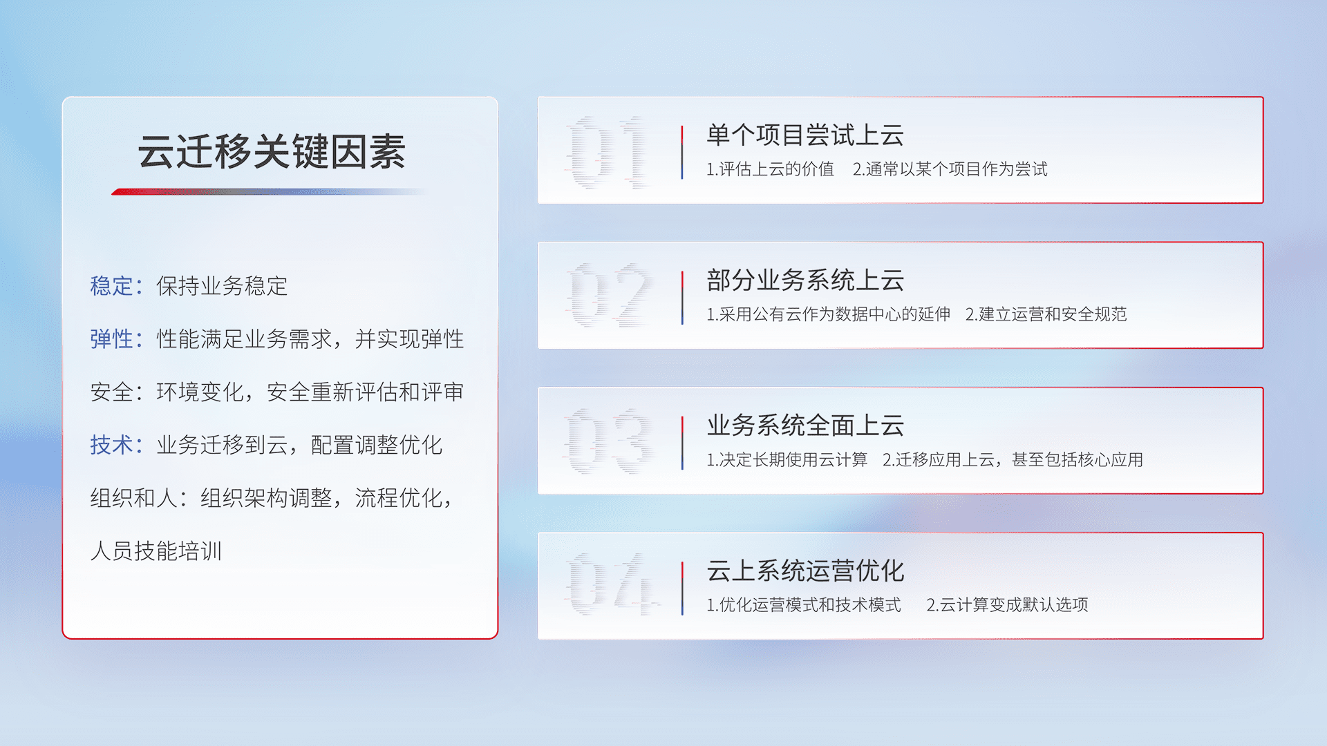 结合实际业务,,,,从规划设计、、、、云平台选型、、、、云原生改造、、数据迁移、、、集成交付,,迁移全过程为客户识别最佳上云路径,,做好风险识别管理,,设计网络架构、、、、身份权限、、、、安全审计合规、、、、操作审计、、日志审计、、、、监控告警策略、、、多站点容灾设计等,,,,对云上基础设施进行整体规划,,提升IT治理水平,,,,以满足弹性、、高可用、、、、高性能的需求。。。