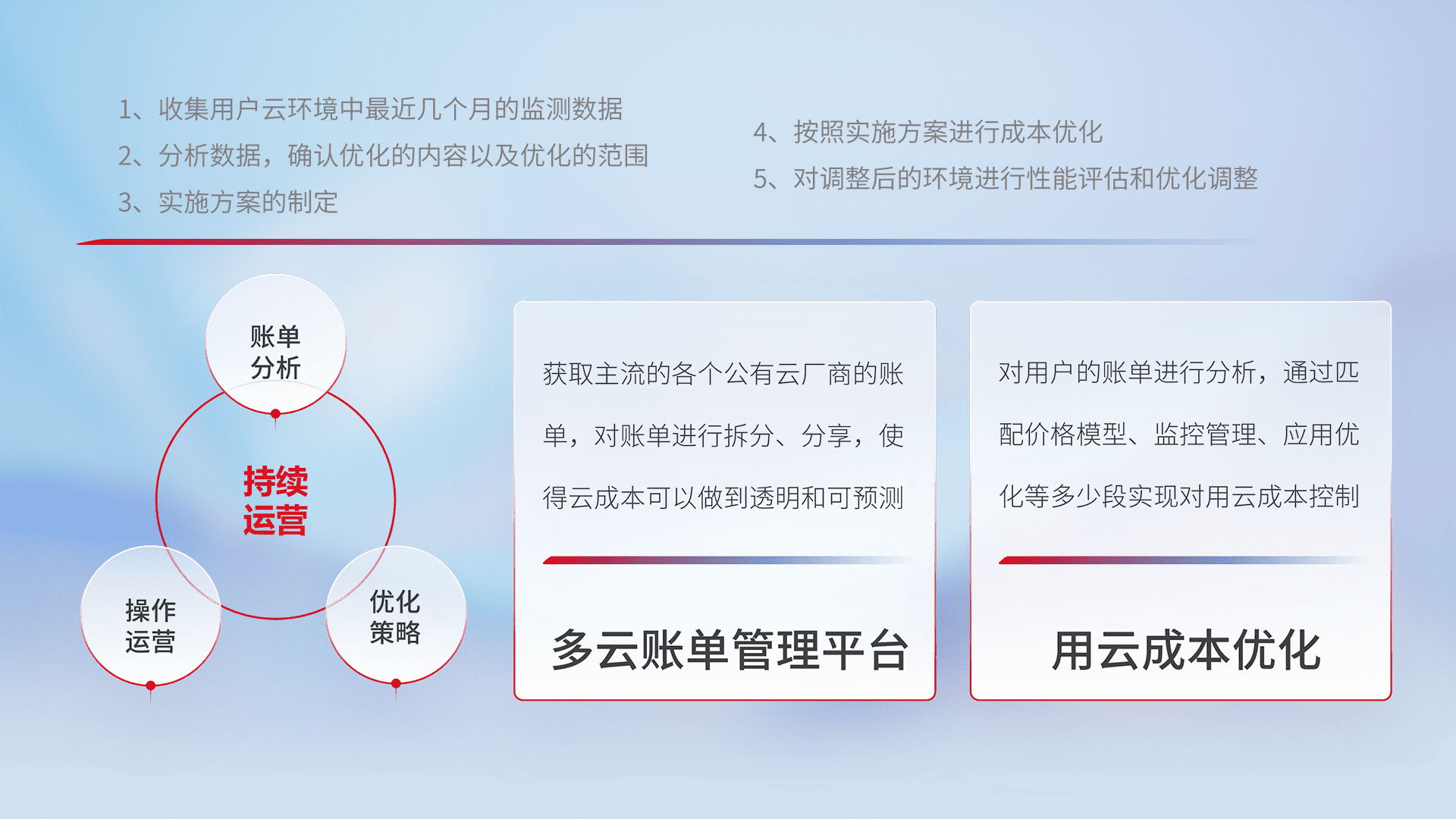 通过多云纳管,,,以统一的资源数据模型把客户的云资源进行抽象和封装,,进而实现对多云资源的统一操作,,,保障云资源管理的可靠性、、、稳定性与可用性。。量身定制化运维内容,,,配置、、、、开发运维、、、、补丁管理、、、备份、、、监控、、认证和访问管理、、、审计和日常巡检等,,,保障在用云过程中的可靠度,,,稳定度以及高可用率。。。
